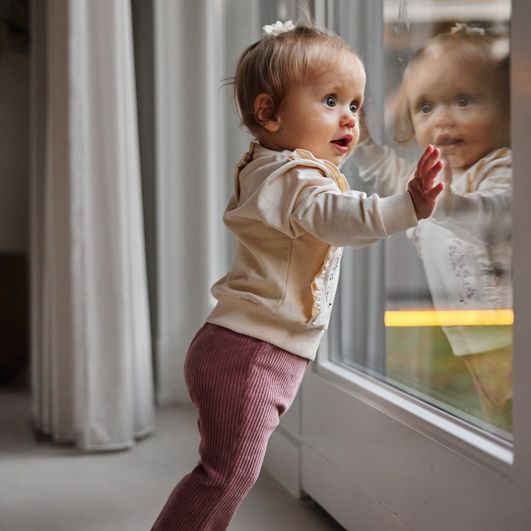 Disse søte Dirkje-buksene med utsving i en varm gammelrosa farge er en skikkelig høstfavoritt. Det myke kordfløyelsstoffet i ribbet materiale gir et lekent utseende, og de utsvingte beina fullfører antrekket. Takket være den fine passformen på jentebuksene med ribbet materiale, kan den lille bevege seg fantastisk.