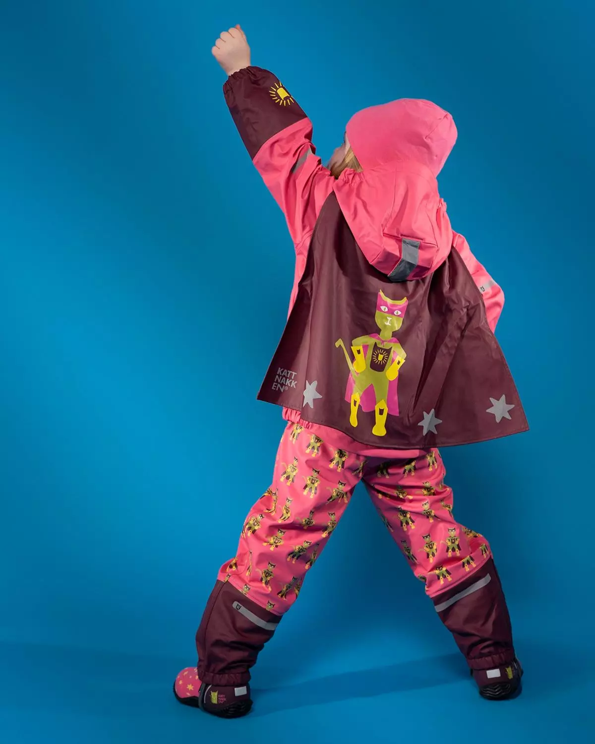 Nyheit! Regnsett Plask Superhelt kolleksjon «Superkatten 2026» – med eigen superheltkappe! Sjå kor stilig! Her blir det leik, fart og regnglede på sitt beste når dei små spring rundt som superheltar.